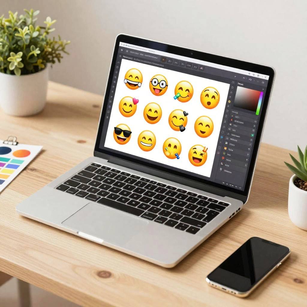 AI sticker generator free, creative workspace with a sleek laptop showing sticker creation software, diverse vibrant emoji-style stickers being designed, cozy artistic studio lighting, colorful digital art tools scattered around, modern flat design, soft shadows
