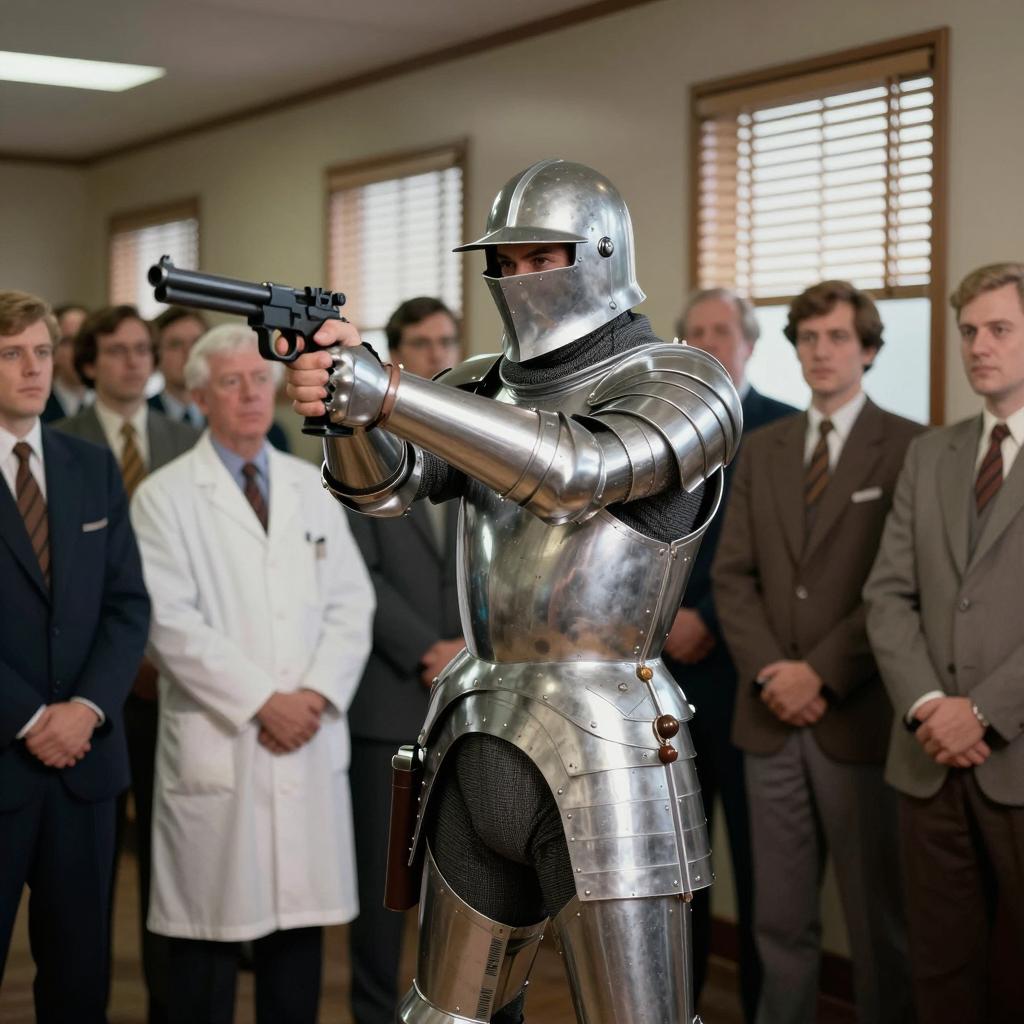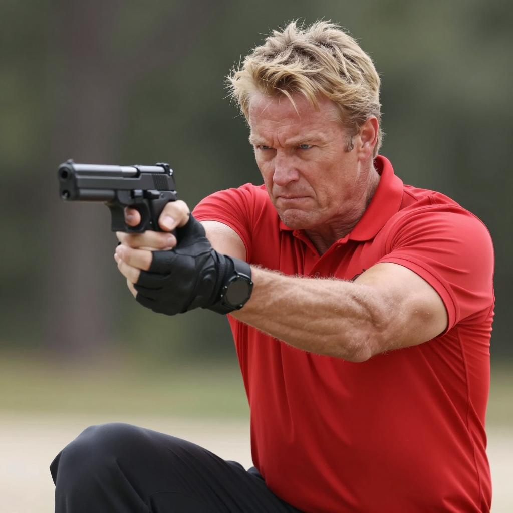Middle-aged man with blond hair, wearing sunglasses, red plaid shirt, and beige vest, holds a wooden shotgun above his head. Multiple handguns float around him against a bright blue sky. His face shows a confident smile. His right hand has a bracelet. The guns are silver and black, with one having a wooden grip. The man's left hand is raised. The image has a digital, illustrative style.