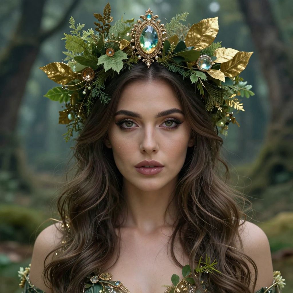 A woman adorned with a lush, enchanted crown of verdant foliage, golden leaves, and sparkling gemstones, exudes a mystical aura as she stands amidst a dreamy forest backdrop, where nature and magic intertwine seamlessly.