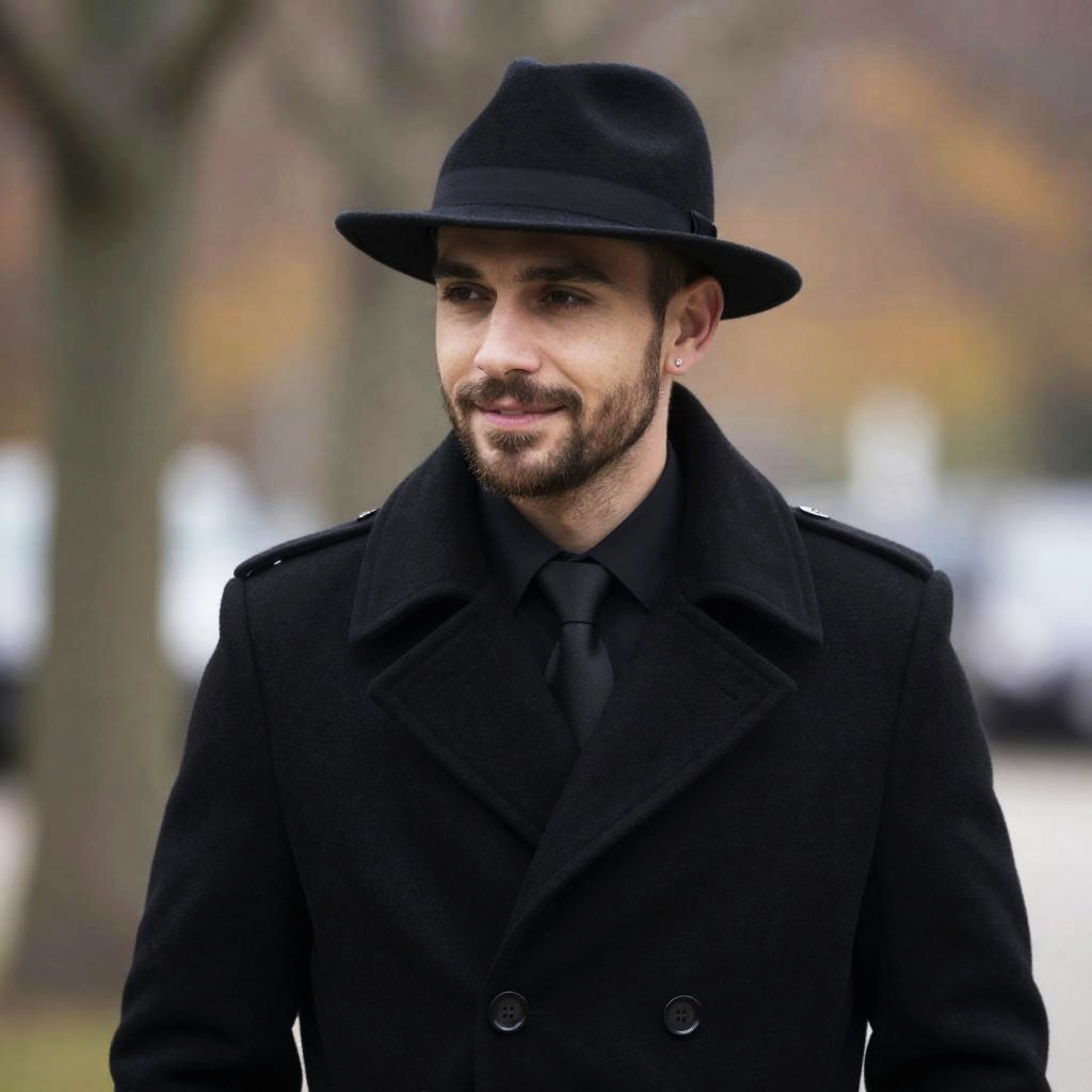 Photograph of a man in a black double-breasted coat and black fedora, standing outdoors. He has a light beard, wears a black tie, and has a small earring in his left ear. Background: blurred trees and autumn leaves. Man's expression is slightly smiling, looking to the side.
