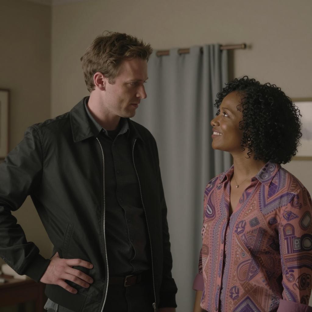 A young man and woman lying closely together on a striped blanket indoors, positioned against a stone wall background. The man has short brown hair and wears a green cardigan over a light blue star-patterned shirt. The woman has blonde hair, wearing a purple hooded top over a light purple star-patterned shirt. Both have intense, slightly concerned facial expressions, with the man resting his head on the woman's shoulder.