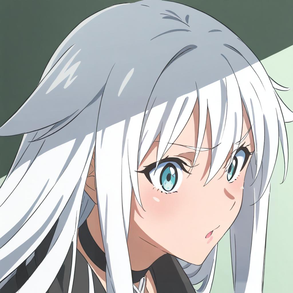 Close-up portrait of an anime girl with long white hair and green eyes. The character has light skin, a serious expression, and wears a black choker. The artwork features smooth shading and highlights, created in a detailed anime style.
