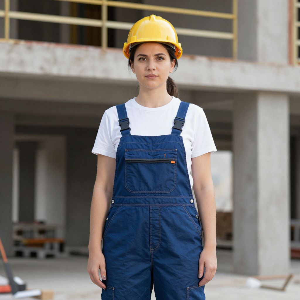 Lady Construction Worker Costume, woman in a hard hat and overalls standing in a building
