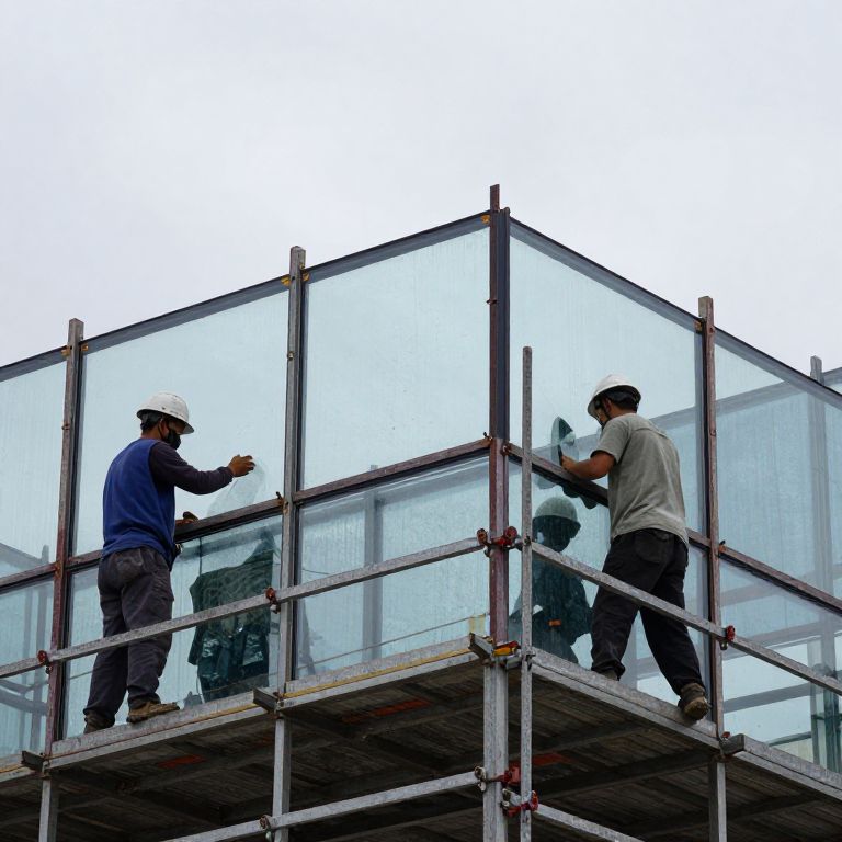 Close-up of workers on a high-rise scaffold installing glass panels under a cloudy sky, illustrating industry construction architecture in progress