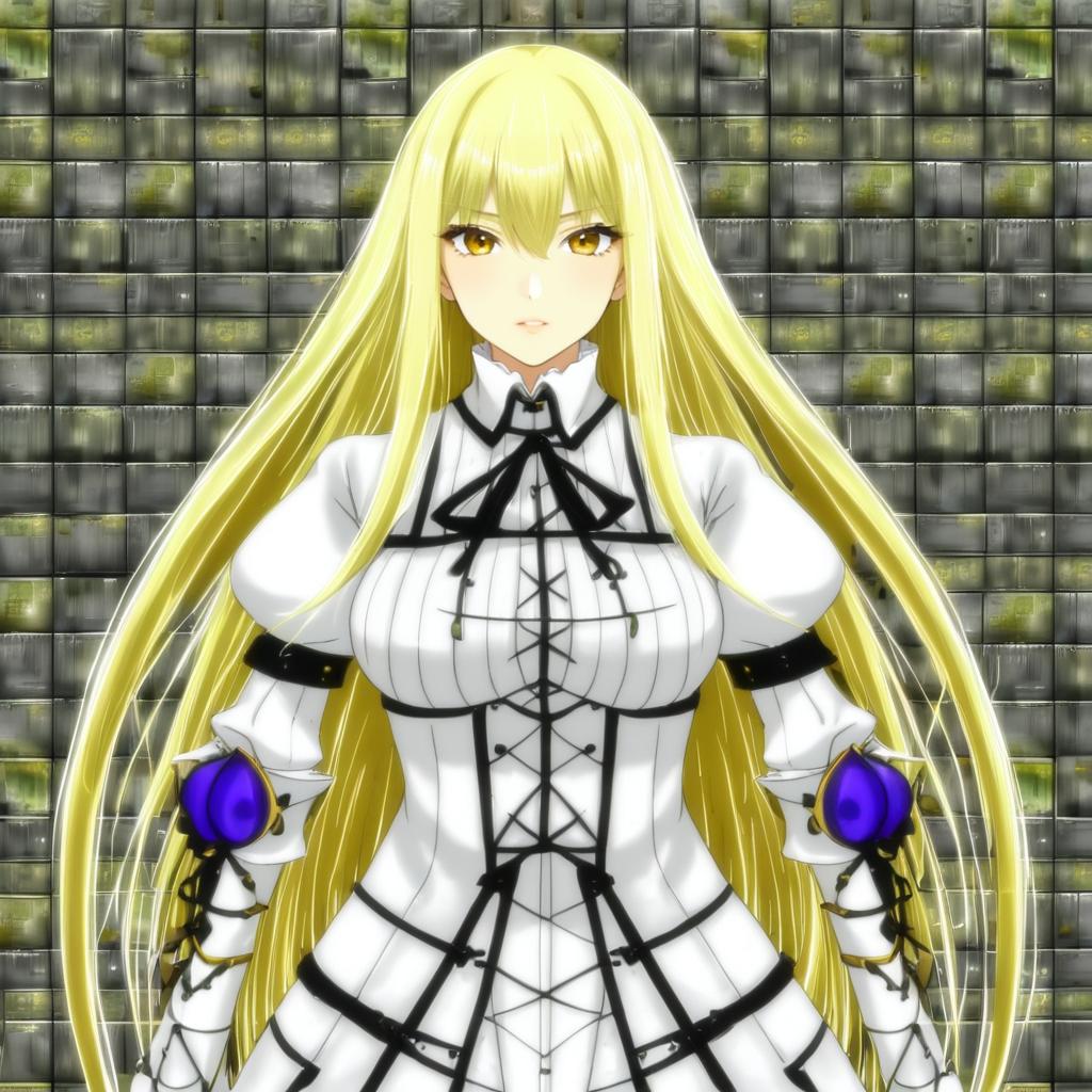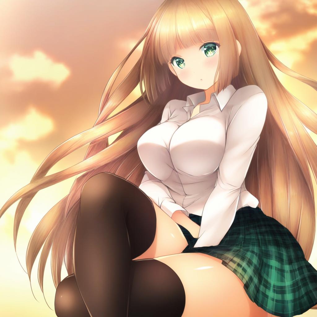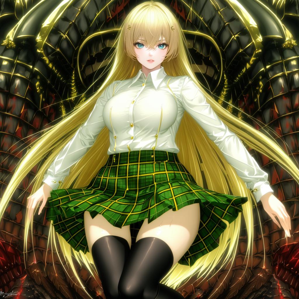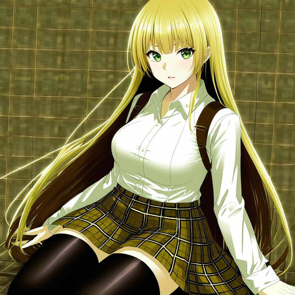 Illustration of an anime-style girl with very long blonde hair and green eyes, wearing a white button-up shirt, a yellow and brown plaid skirt, and black thigh-high stockings. She has blunt bangs and a school uniform-inspired outfit, depicted with medium to large breasts. The artwork is detailed with a focus on the character's facial features and hair texture.