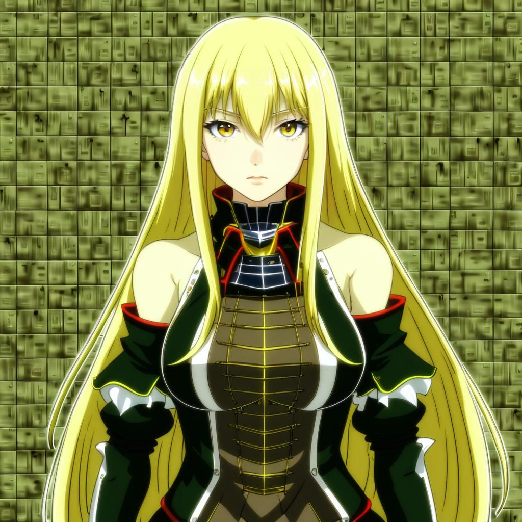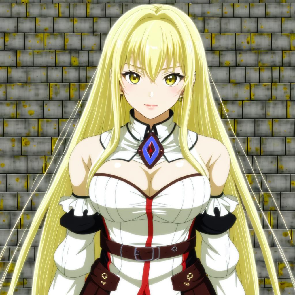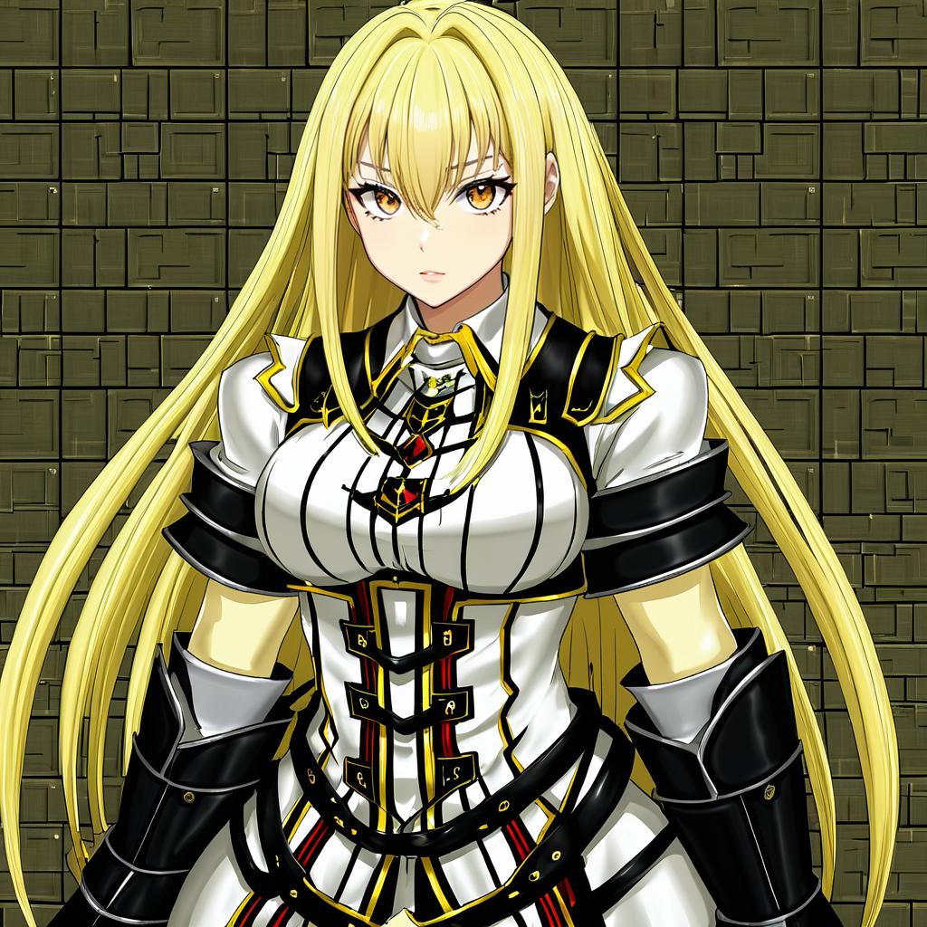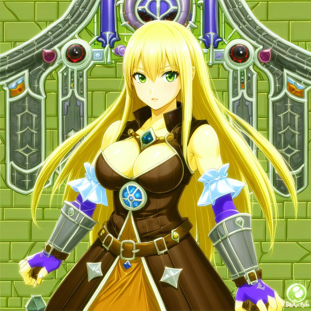 Illustration of an anime-style girl with very long blonde hair and green eyes, wearing a white button-up shirt, a yellow and brown plaid skirt, and black thigh-high stockings. She has blunt bangs and a school uniform-inspired outfit, depicted with medium to large breasts. The artwork is detailed with a focus on the character's facial features and hair texture.
