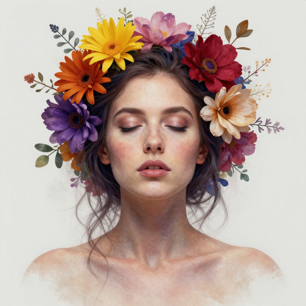 "Brush Pen Beautiful adult woman with her eyes closed, portrait, flowers, colorful, artistic, realistic, mysterious, powerful,"
