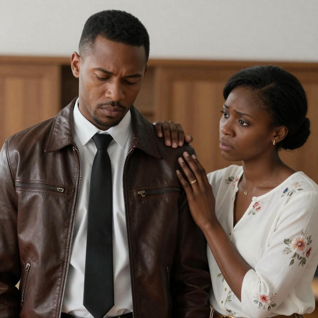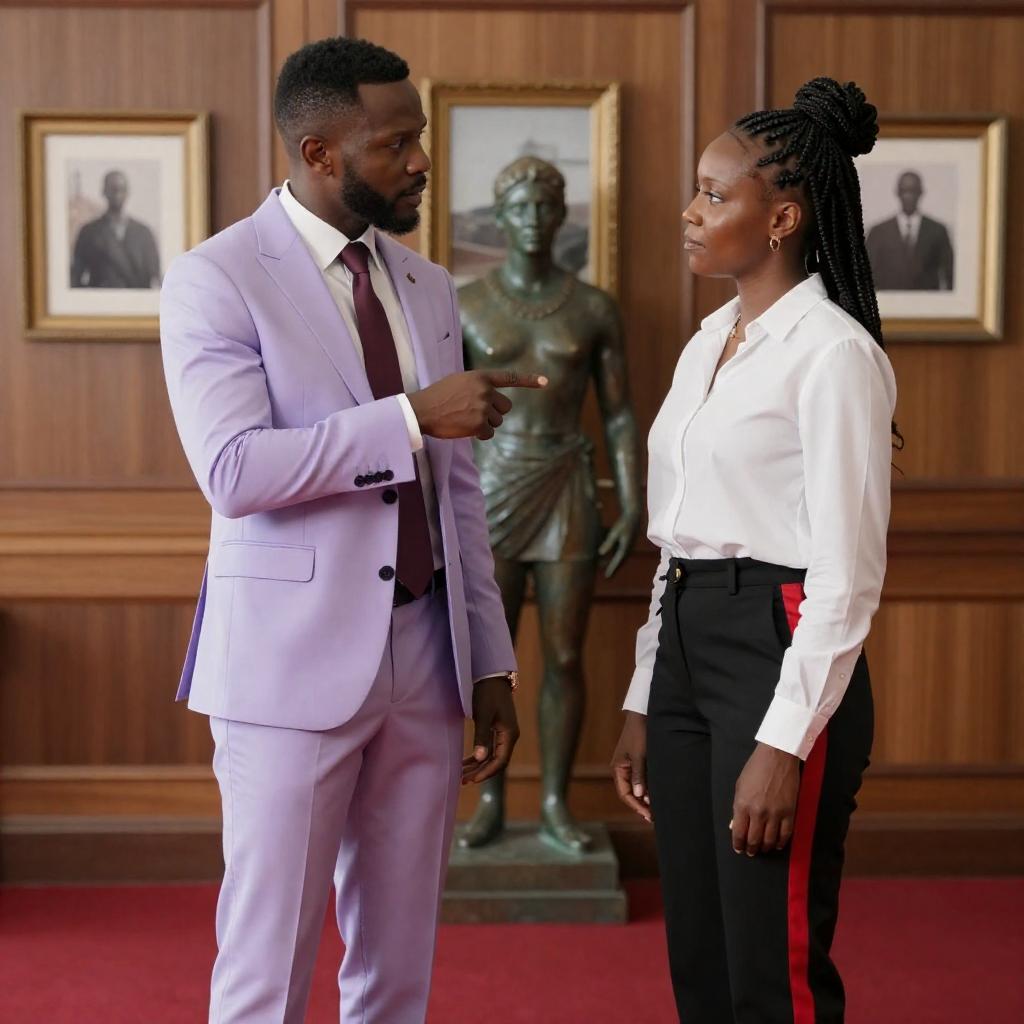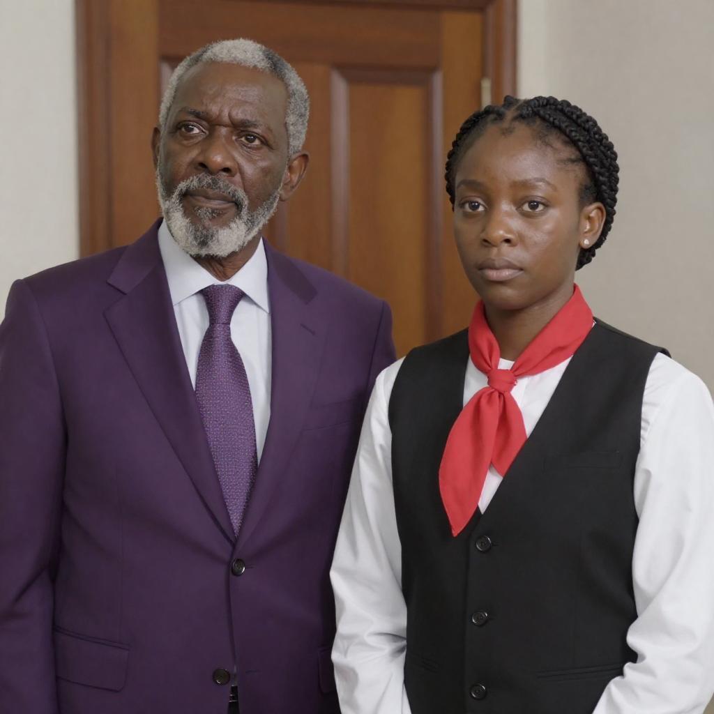 Photograph of two people standing indoors. An older Black man with a gray beard and mustache wears a purple suit with a white shirt and patterned tie. A younger Black woman with braided hair wears a white shirt, red scarf, and black vest. Wooden door in the background. The man looks to the left, the woman looks forward. Both have neutral facial expressions.