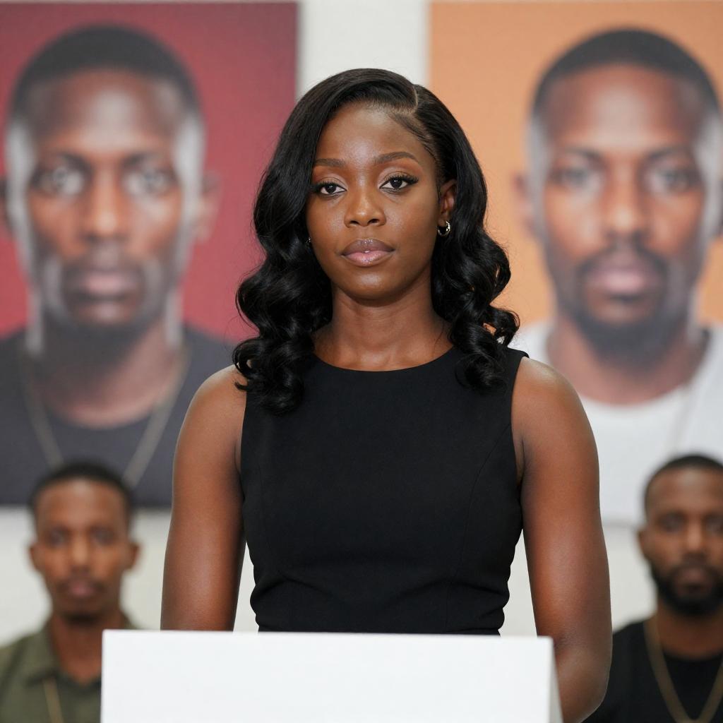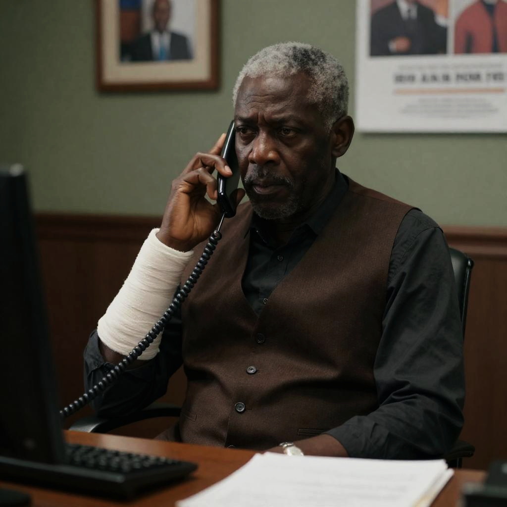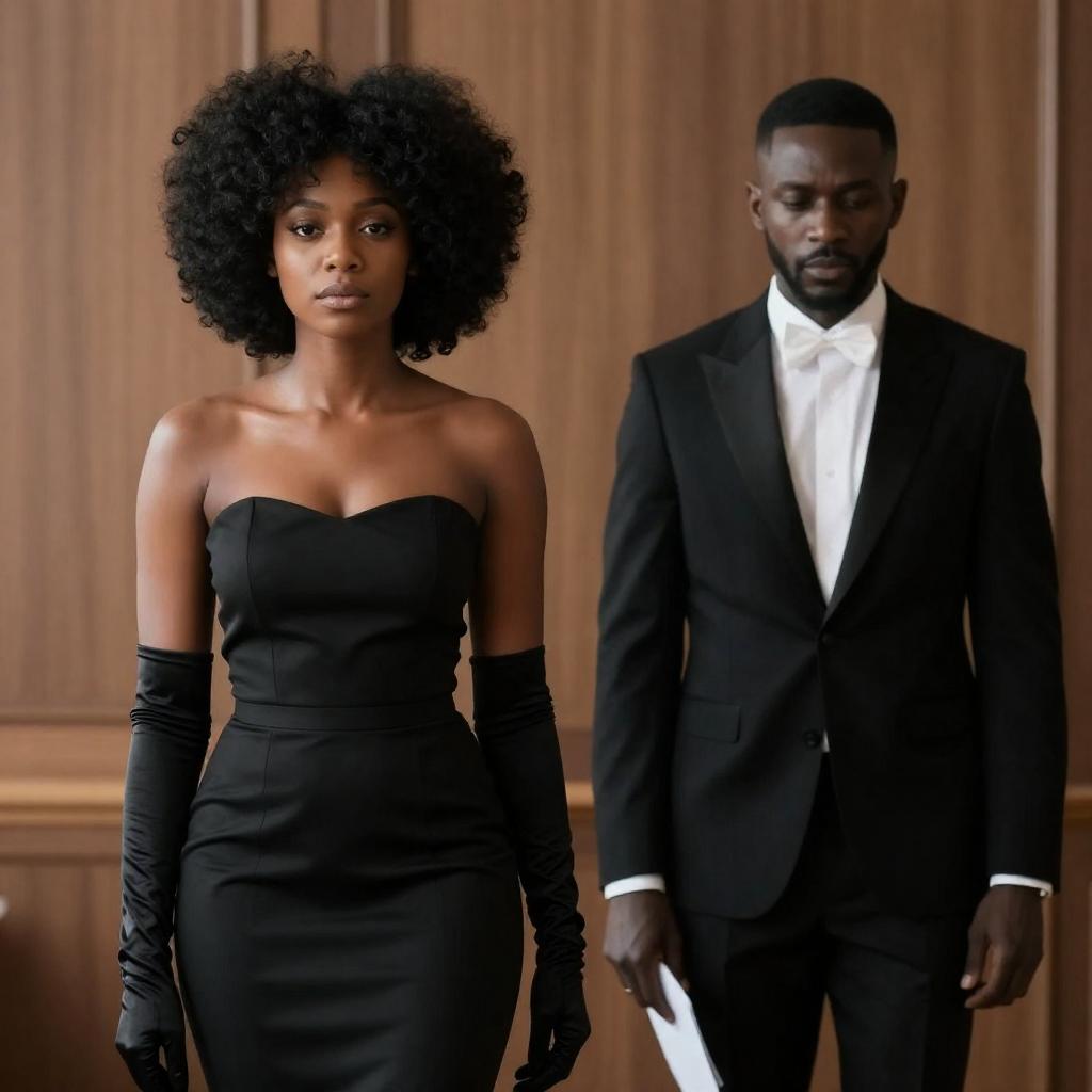 Photograph of two people standing indoors. An older Black man with a gray beard and mustache wears a purple suit with a white shirt and patterned tie. A younger Black woman with braided hair wears a white shirt, red scarf, and black vest. Wooden door in the background. The man looks to the left, the woman looks forward. Both have neutral facial expressions.
