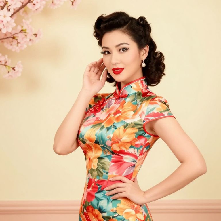 Asian pinup girl styled in vibrant 1950s fashion, wearing a floral cheongsam dress, retro hairstyle with victory rolls, classic makeup with red lips, posing against a vintage pastel backdrop, soft lighting, and delicate cherry blossom accents.