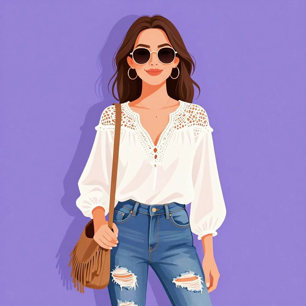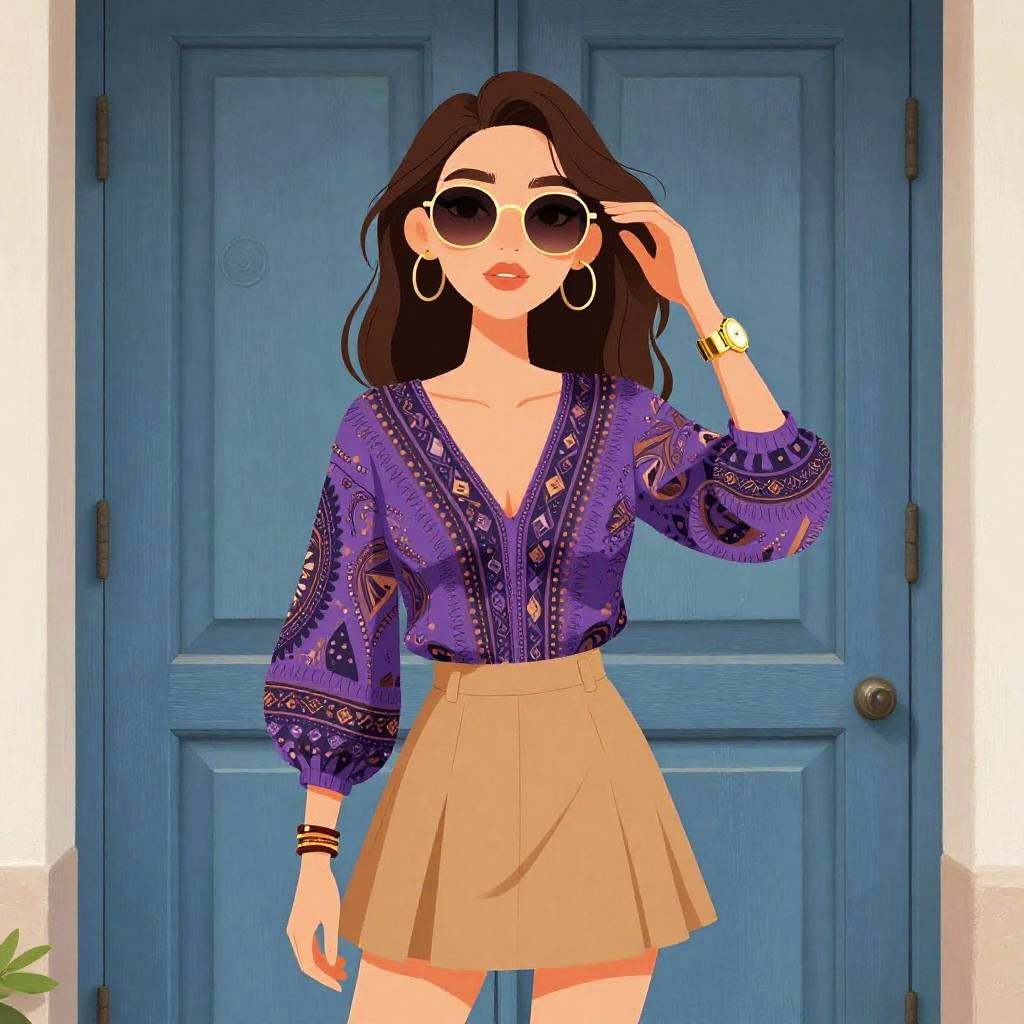 Digital illustration of a stylish woman standing in front of a blue door. She has medium-length, wavy dark brown hair, wears large round sunglasses, and sports a purple, long-sleeve, patterned blouse with intricate designs. Her high-waisted, tan, pleated skirt is short, revealing her legs. She accessorizes with large hoop earrings, a gold wristwatch on her left wrist, and several black bracelets on her right wrist. The blue door behind her has a rustic texture and a black doorknob. The overall style is modern and fashionable, with bright, bold colors and clean lines.