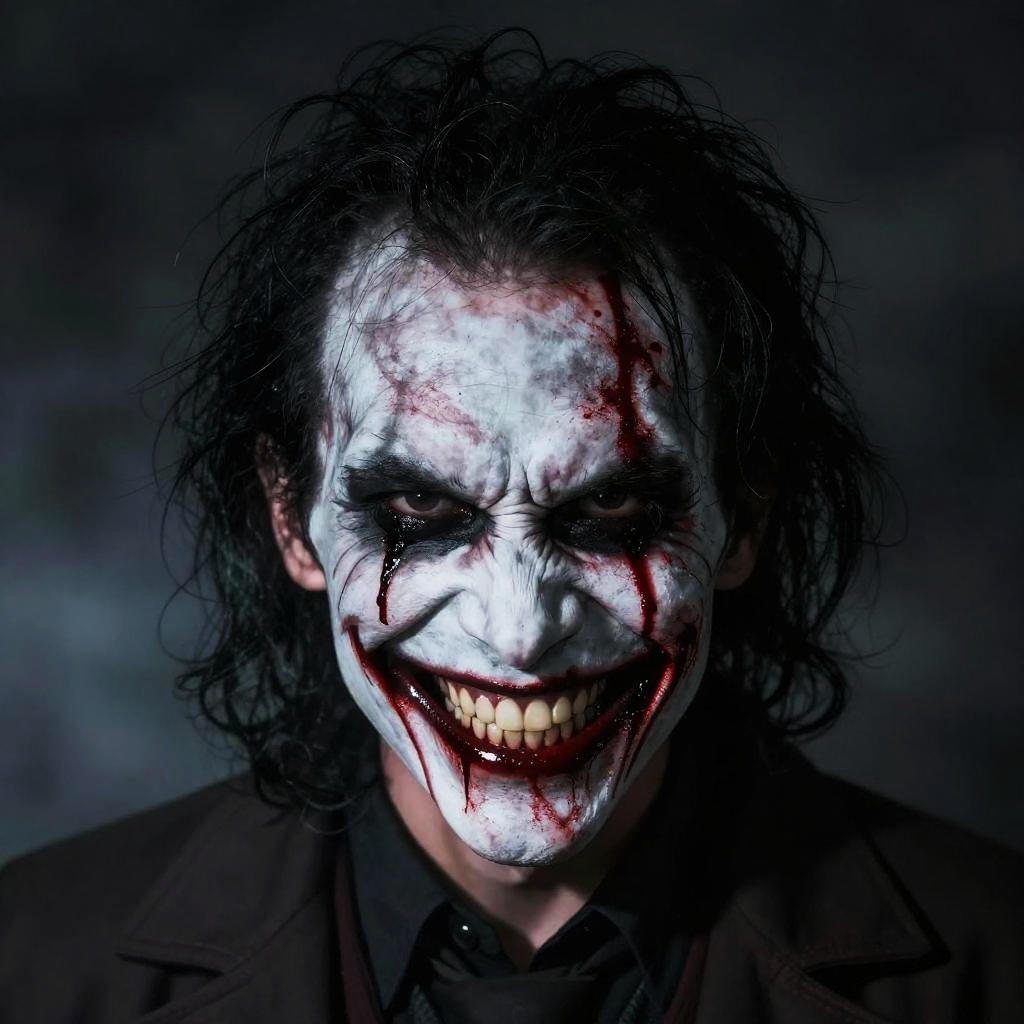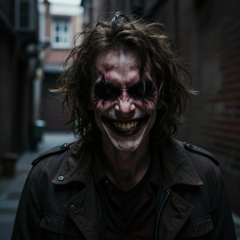 Portrait of a character with a crazed smile, wild hair, dark shadows on face, eerie atmosphere, dimly lit alley, hyperrealistic style, dramatic lighting