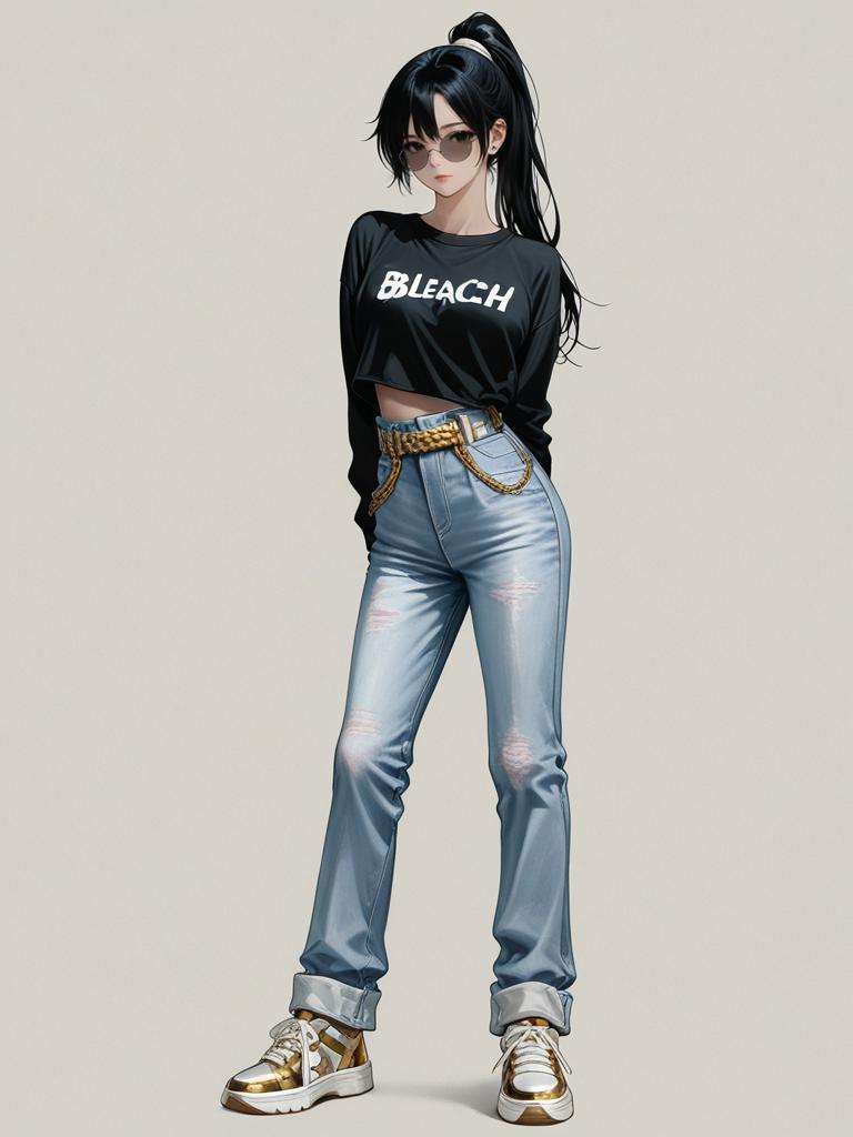 Full body shot of a young woman with a realistic face, styled in casual streetwear. She wears a cropped black sweatshirt with 'BLEACH' printed on it, high-waisted bleach-wash jeans featuring frayed hems, and a chunky gold chain belt. Accessories include round white-framed sunglasses, white stud earrings, and gold and white high-top sneakers. Her black hair is tied in a high ponytail against a minimalist white studio background.