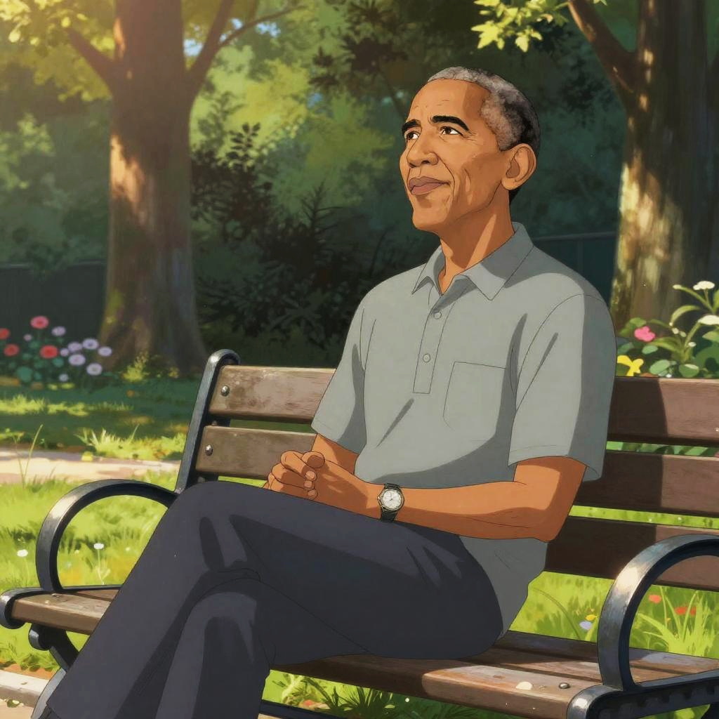 Anime style Obama at a peaceful park bench, casual clothing with subtle anime flair, lush green trees and flowers in background, gentle lighting during sunset, soft brush strokes, serene and reflective atmosphere capturing inner strength and wisdom