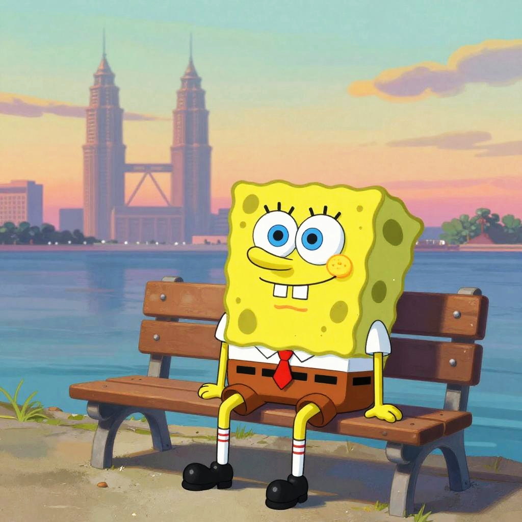 Digital illustration of a middle-aged man with short gray hair, wearing a light blue shirt and dark pants, sitting on a park bench, smiling, with