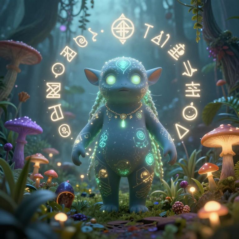 A digital CGI image of a glowing, blue, goblin-like creature with neon green eyes and intricate bioluminescent patterns on its body, standing in a mystical forest. The creature has braided, glowing hair and wears a necklace with a glowing pendant. Surrounding it are luminescent, floating letters forming a circular pattern above its head. The forest floor is adorned with colorful, glowing mushrooms, and the background features tall, shadowy trees. The scene is illuminated by soft, ethereal light, creating a magical and otherworldly atmosphere.