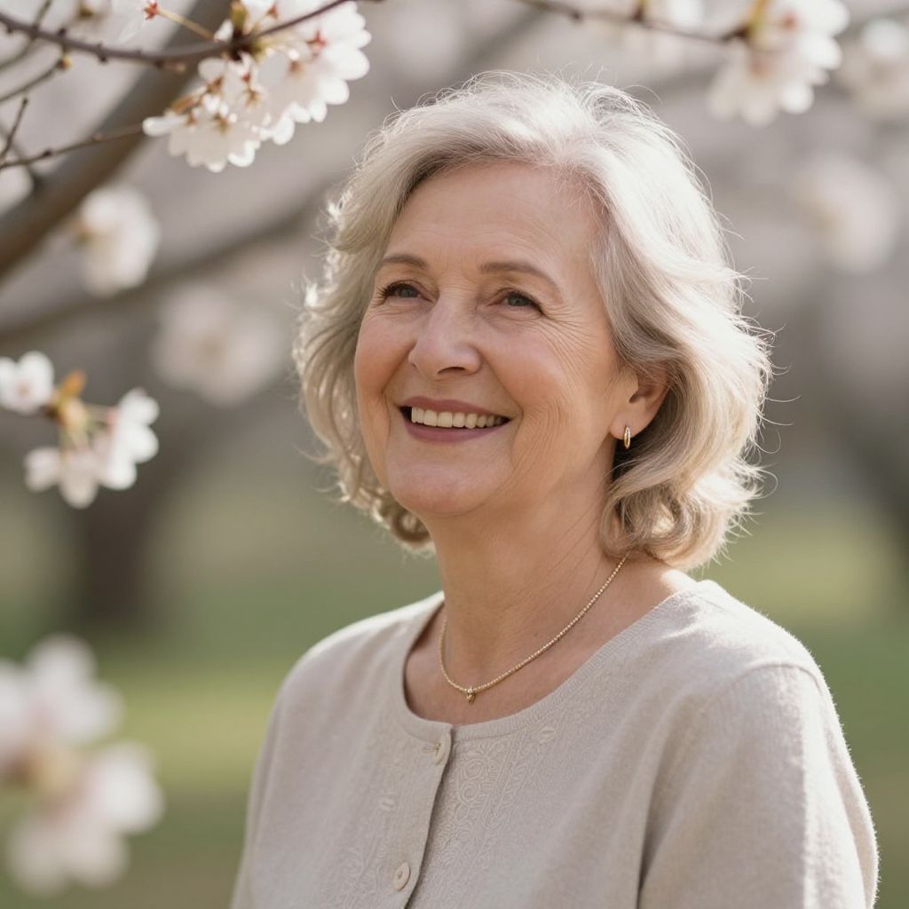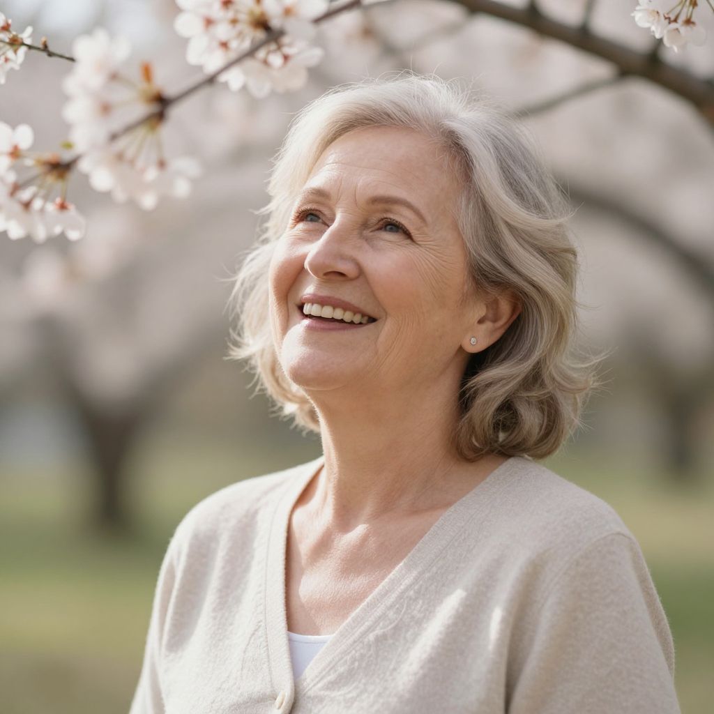Radiant serenity blooms in the gentle smile of an older woman, her laughter echoing the whispers of spring, as soft sunlight and the scent of blossoms intertwine with the timeless beauty of renewal.