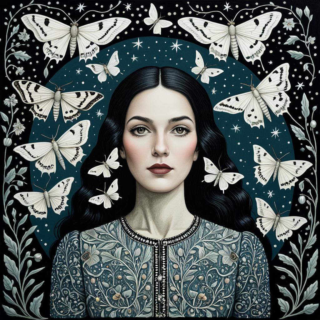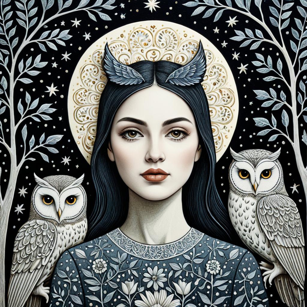 A beautifully detailed digital illustration of a night-themed girl with long black hair adorned with feather-like horn ornaments. She is flanked by two white owls with striking yellow eyes. The background features a dark starry night sky with silver leafy trees framing the composition. The girl wears an intricately patterned dress with floral motifs. The style is highly detailed, soft pearlescent colors with 3D and high definition effects, inspired by Morris Hirshfield, Genevieve Godbout, and Amy Giacomelli.