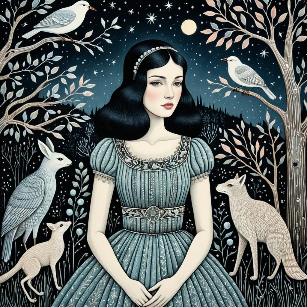 She is a night girl with night owls, in the style of Morris Hirshfield, Genevieve Godbout, Amy Giacomelli. Soft pearlescent colors, extremely detailed, intricate, beautiful, 3D, high definition.
