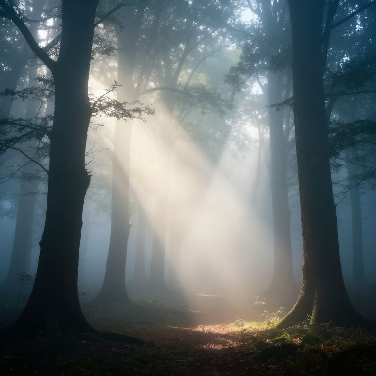 Photograph of a misty forest with sunbeams piercing through tall trees, creating a ethereal, glowing light effect on the forest floor.