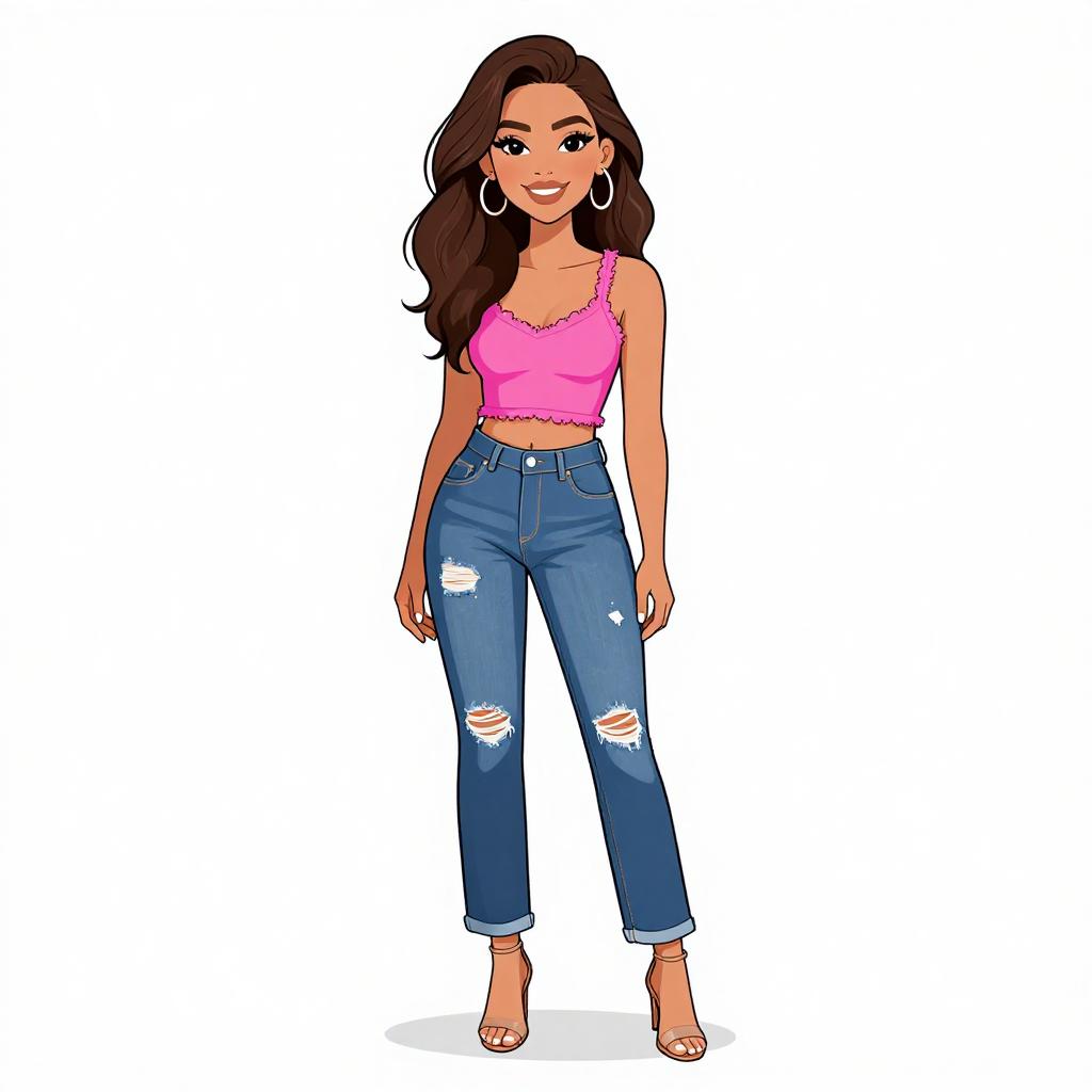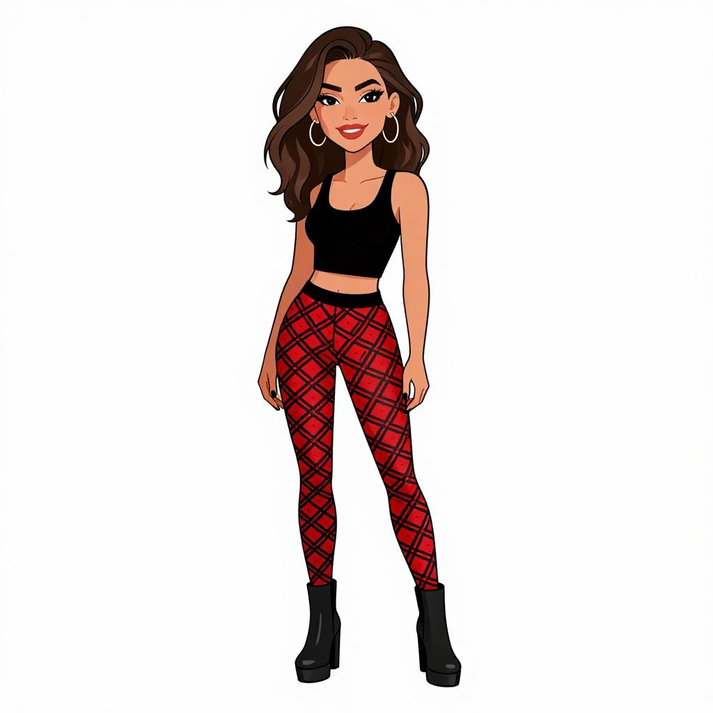 Woman with pretty face and pretty hair. smiling Woman, edgy street style, black mesh crop top with a solid long sleeve, polka-dot mesh chest panel, high-waisted faux leather shorts, black chunky-heeled ankle boots, white background. --sref 1467