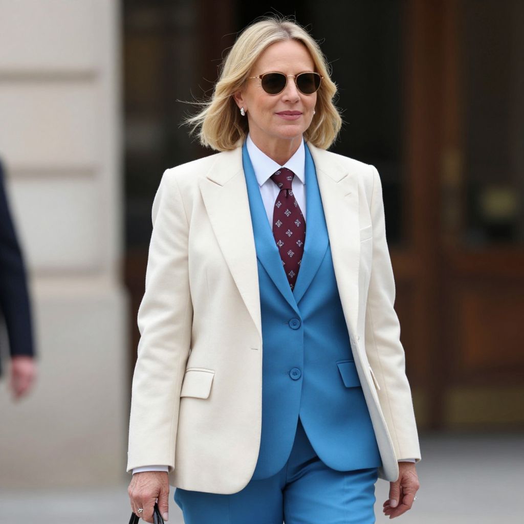 Blonde woman wearing a cream white blazer over a vibrant blue suit, paired with a patterned burgundy tie and sunglasses, smiles confidently while walking outdoors.
