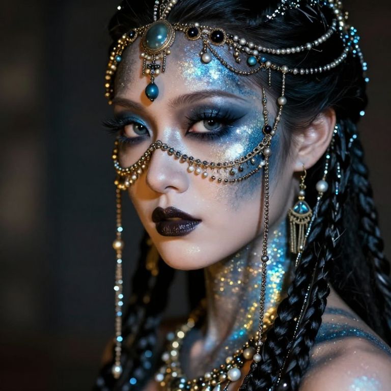 In the depths of a mystic reverie, a dark-skinned enchantress materializes, her presence a whispered secret in the velvet darkness, Her eyes, like shattered emeralds, glimmer with an unholy light, as if the very essence of the forest has been distilled into their piercing gaze, A tattered, lace-like veil, a gossamer whisper of forgotten dreams, clings to her skin like a damp, moonlit mist, casting an eerie, silvered glow across her features, The light that bathes her is a crazed, flickering thing, a mad dance of sunbeams and shadowy tendrils that twist and writhe like living serpents around her face, Upon her head, a crown of jagged, chrome splinters reigns, its diamonds flashing like a riot of fireflies on a summer's night, as a diamond-encrusted necklace slithers around her neck like a glittering, venomous serpent, A face ornament, a delicate, bejeweled latticework, sprawls across her cheeks and forehead like a mad, its silver chains and diamonds glinting with a manic, fevered light, as if the very fabric of reality has been torn asunder to reveal a glimpse of the surreal, dreamlike realm that lies beyond, And yet, amidst this maelstrom of color and light, the enchantress remains, a serene, unyielding presence, her gaze a cold, dark mirror that reflects the very soul of the viewer, drawing them in with an otherworldly allure, a siren's call that beckons them deeper into the heart of the madness
