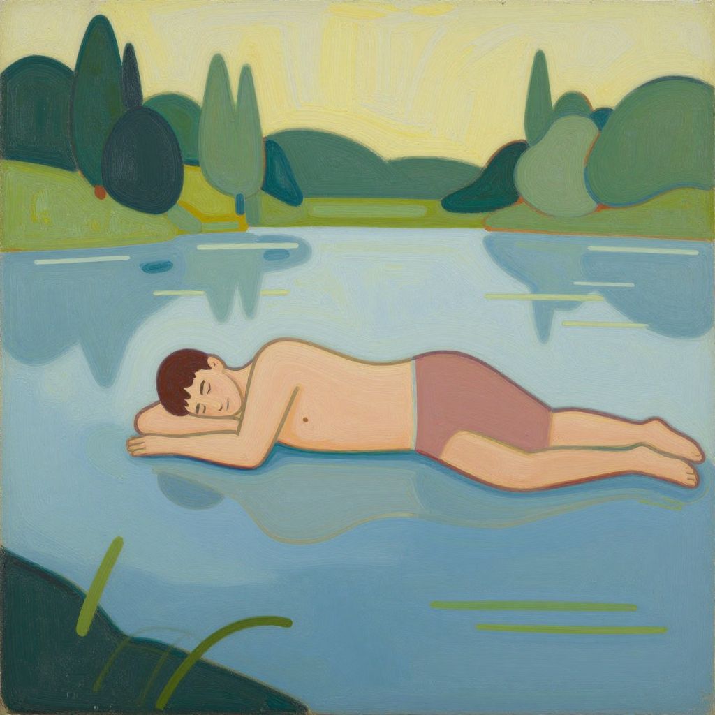 Painting of a fair-skinned, brown-haired man in pink shorts, lying face down on a calm, reflective lake with greenery in the background