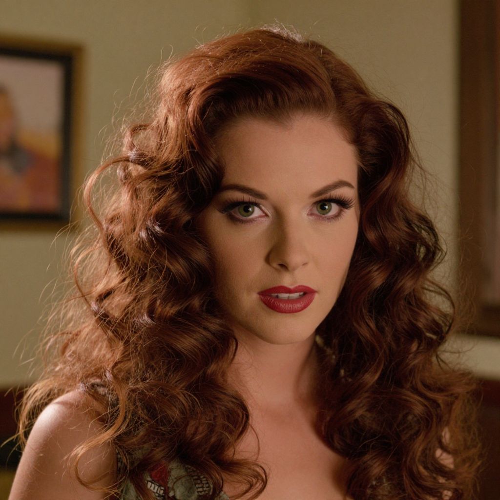 Photograph of a fair-skinned woman with voluminous, curly auburn hair, red lipstick, and green eyes, wearing a dark top,