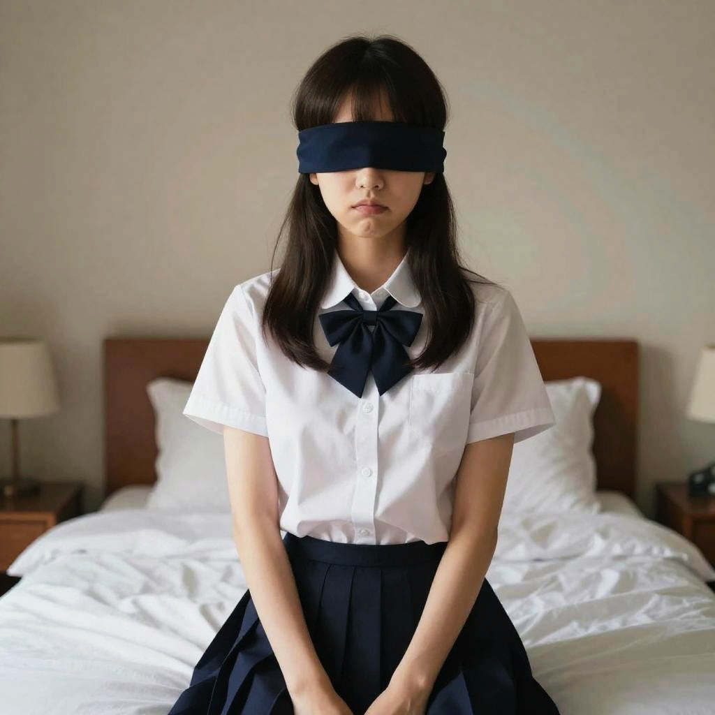 Masterpiece, best quality, realistic, 8k, official art, cinematic light, ultra high res, 1girl, blindfold, lip biting, school uniform, bedroom