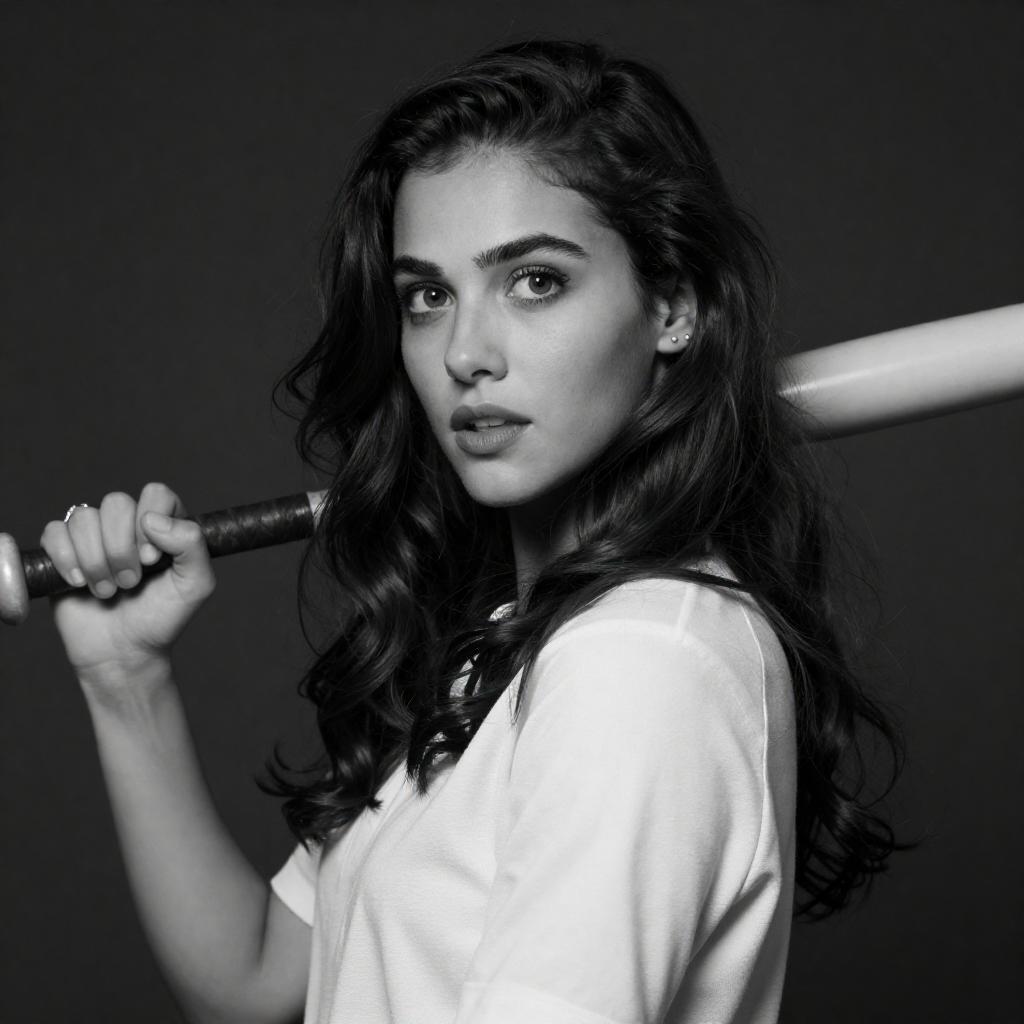 Black and white photograph of a woman with long, wavy dark hair, holding a baseball bat over her shoulder. She has wide eyes and a slightly open mouth. Wearing a light-colored shirt, she looks to the left. Background is dark. Her right hand has a ring.