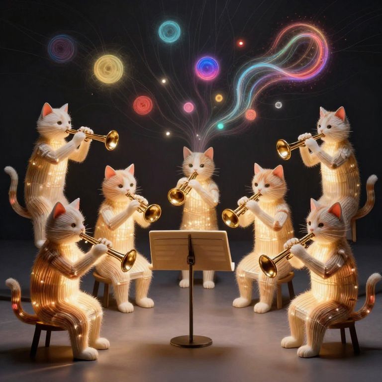An orchestra of cats plays instruments made from light, conducting symphonies that are heard visually, evoking colors and shapes in the air.