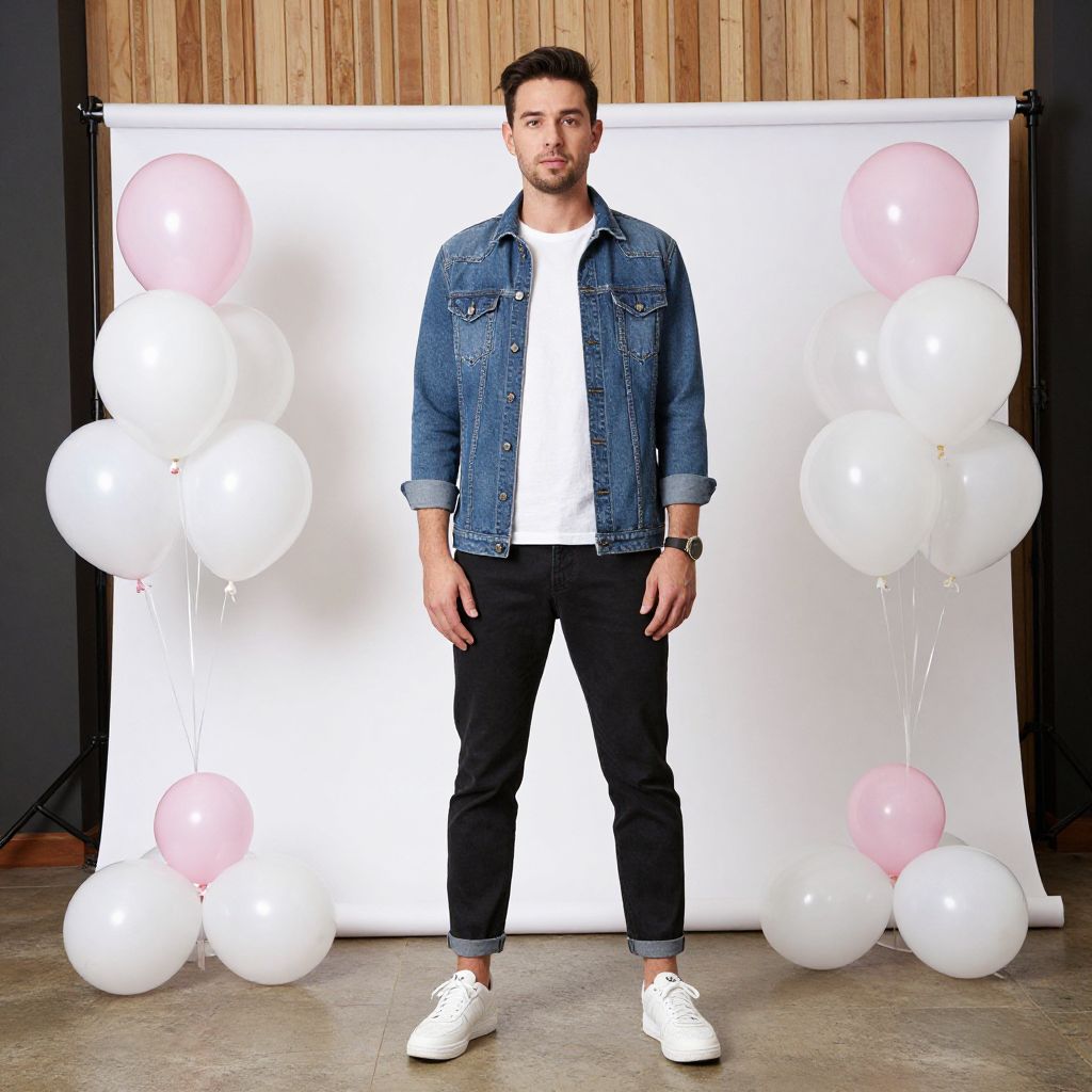 Photograph of a young man standing in front of a white backdrop adorned with clusters of white and pink balloons on both sides. He has short, dark hair and a trimmed beard. He wears a blue denim jacket over a white t-shirt, black cuffed pants, and white sneakers. The wooden panel wall behind the backdrop adds a rustic touch. His stance is relaxed, with hands by his sides, and he gazes directly at the camera. The lighting is even, highlighting the colors and textures. The floor is concrete.