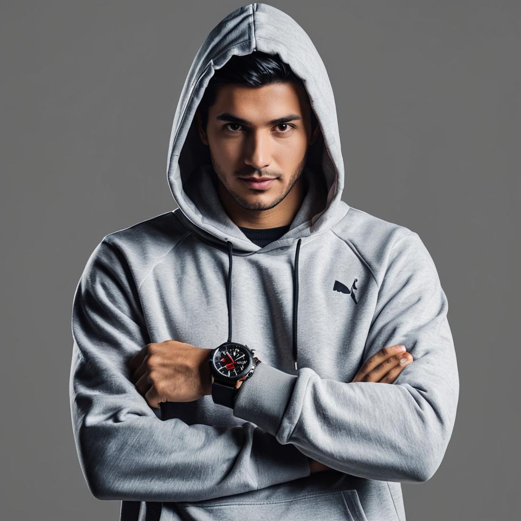 Man fortnite,1boy, male focus, solo, hoodie, hood, black hair, looking at viewer, watch, wristwatch, pants, grey background