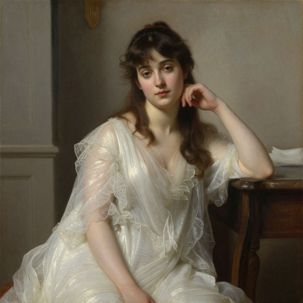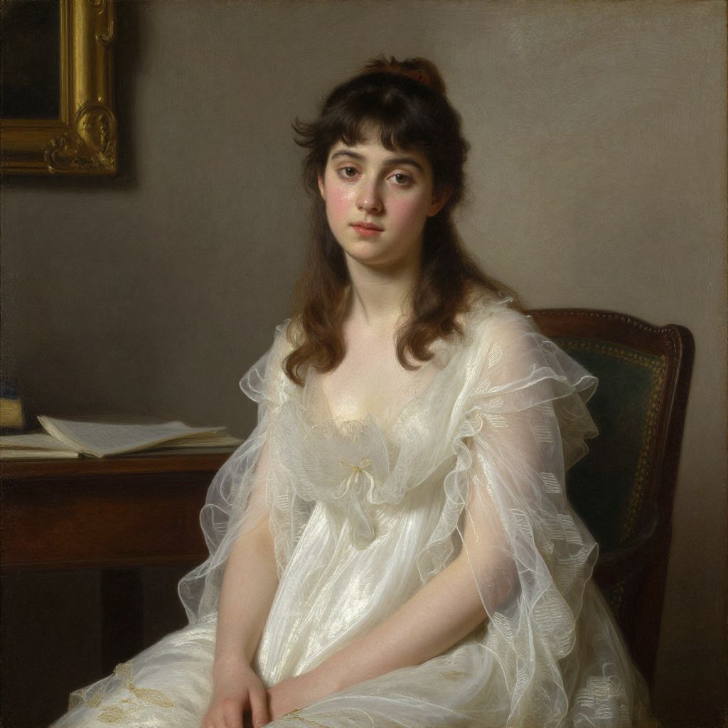 A classical oil painting in the style of William-Adolphe Bouguereau, depicting a young woman in a serene indoor setting, adorned in a delicate white gown with ruffled details, illuminated by soft, natural light that enhances the vintage and high-definition quality of the artwork.
