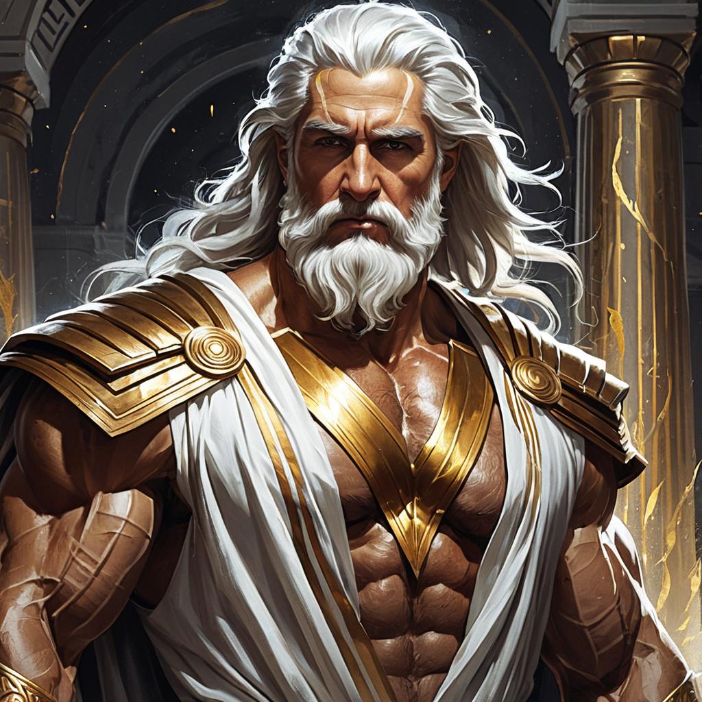 Detailed digital painting of Zeus, Greek god, depicted as a muscular, mature man with flowing white hair and beard. He wears a white robe adorned with gold streaks and armor shoulder plates. The background features classical Greek architectural elements with columns, emphasizing a fantasy and mythological theme. The artwork has a sharp, intricate, and elegant style inspired by famous digital artists.