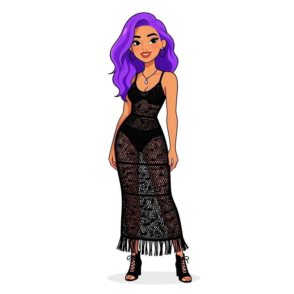 Woman with pretty face and pretty hair. smiling Woman, contemporary bohemian, black crochet knit maxi dress, scoop neckline, thin straps, partially lined with sheer lower half, uneven fringed hem, black cut-out ankle boots with lace-up detail, simple pendant necklace, white studio background. --sref 1461