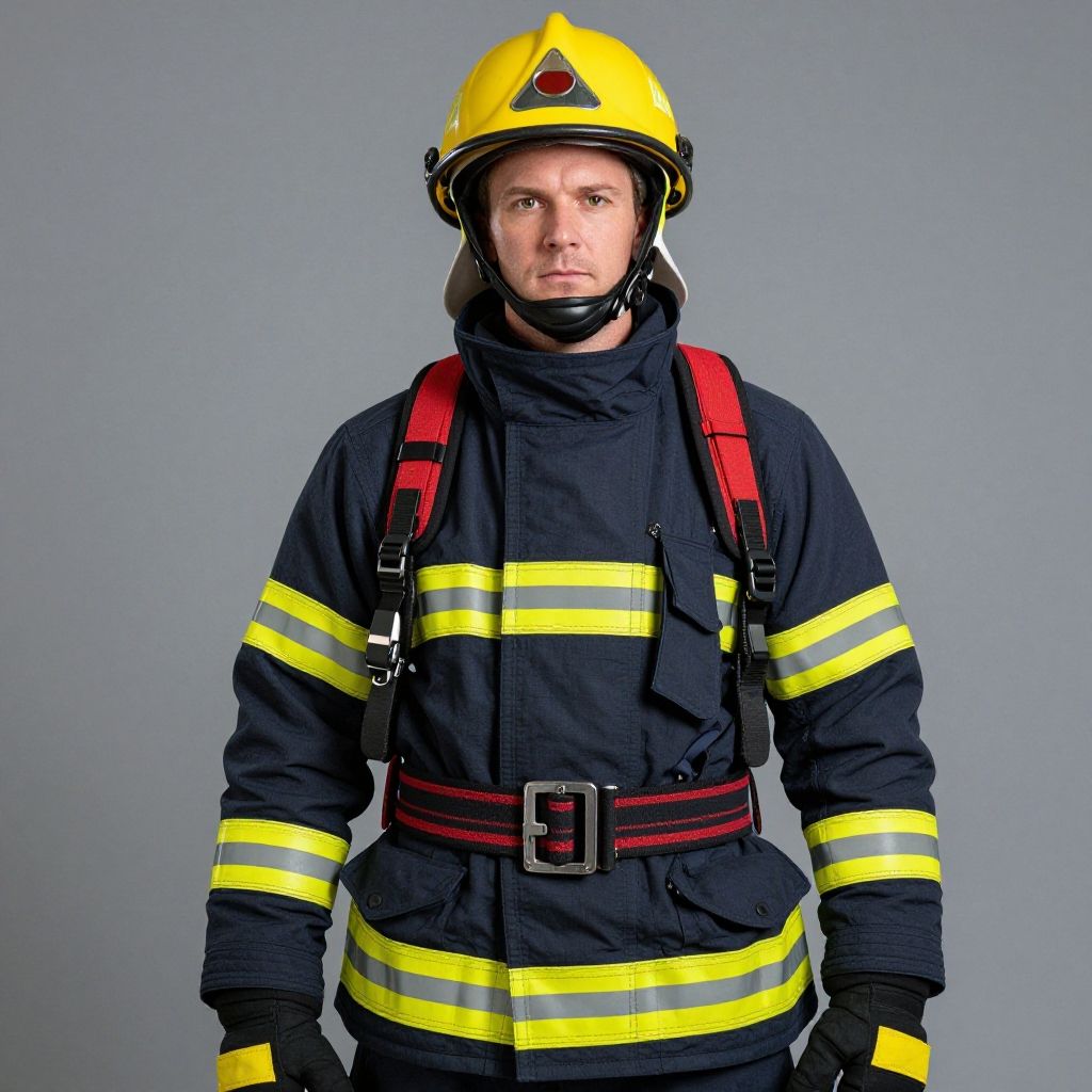 Photograph of a serious-faced female firefighter in black uniform with yellow stripes, helmet, and badge, standing in a red-walled room.