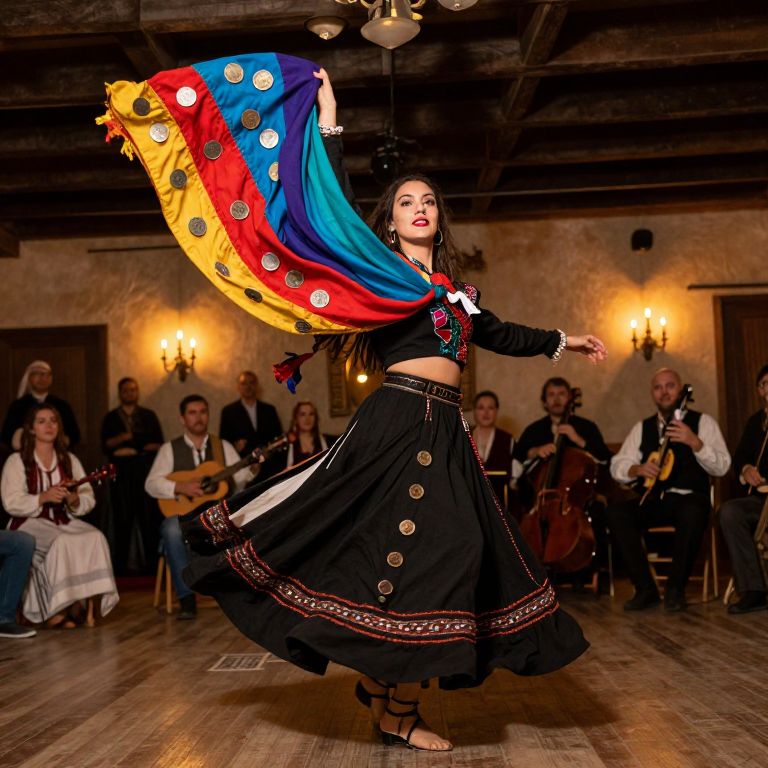 A dynamic, wide-angle photograph of a gypsy dancer in motion, her vibrant scarves fluttering with hand-carved coins sewn into the fabric, her bold red lips and expressive eyes focused on the audience, performing in a candlelit festival hall with traditional folk music playing in the background.
