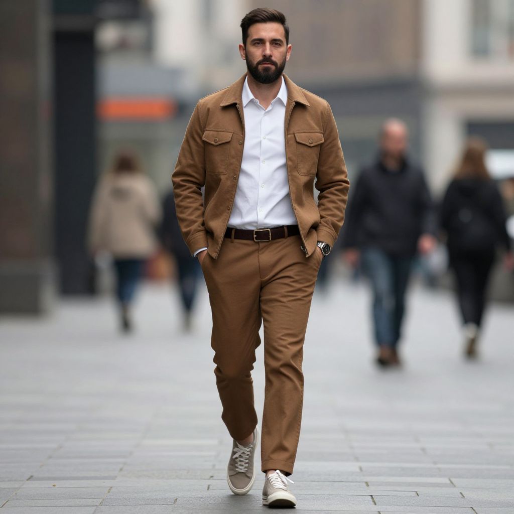 Photograph of a bearded man with dark hair walking confidently down a city street. He wears a brown corduroy jacket with large pockets, a white dress shirt, brown trousers, and white sneakers. His hands are in his pockets, and he has a black belt with a silver buckle. The background is blurred, featuring indistinct figures of people walking and buildings with gray and brown facades. The street is paved with gray tiles, and the overall scene conveys an urban, stylish atmosphere. The man's expression is serious and focused.