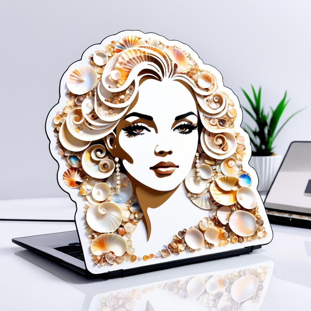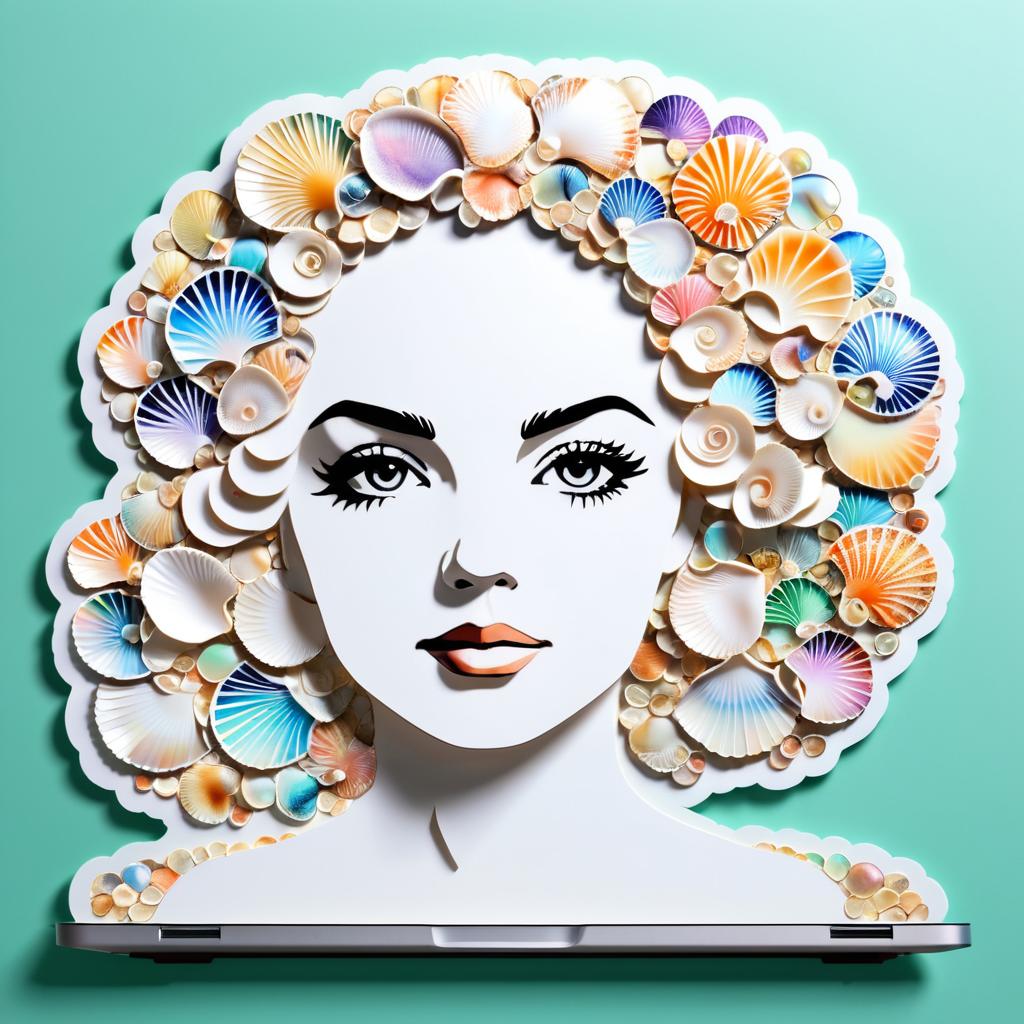 Laptop sticker of a portrait created entirely from seashells arranged to form the features of a woman. The portrait uses seashells for all color filling and shapes, resulting in a beautiful image.