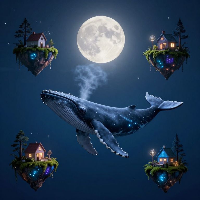 Digital artwork: A glowing full moon illuminates a blue whale flying above four colorful, glowing houses on floating islands surrounded by dark, starry sky.