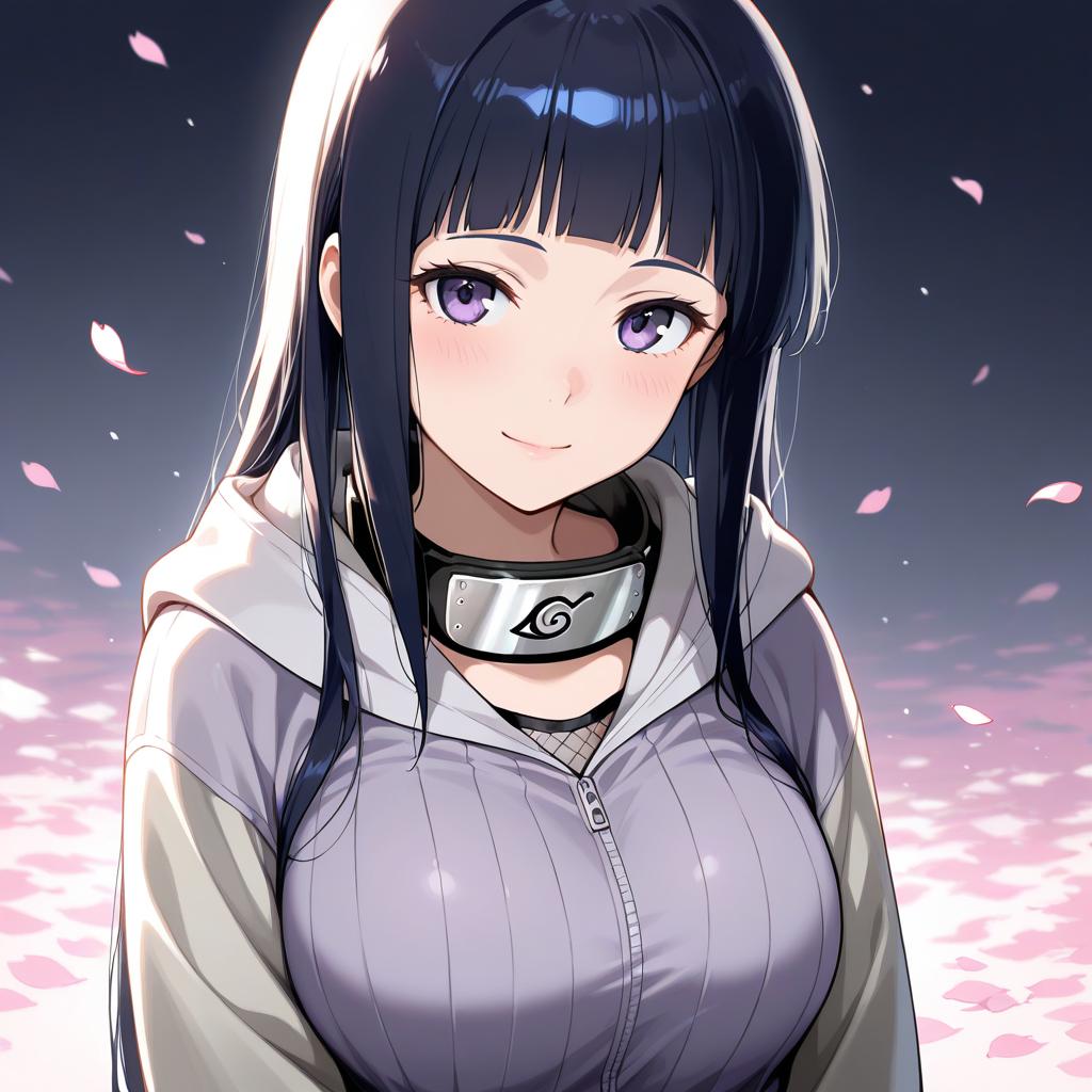 High-resolution anime-style illustration of Hinata Hyuuga from Naruto, featuring long black hair with blunt bangs and a hime cut. She has distinctive grey eyes and is wearing a hooded cardigan with grey sleeves and a fishnet undershirt. A ninja headband is worn around her neck. Falling cherry blossom petals add a soft, serene background.