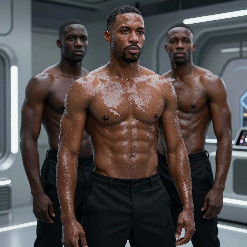 Photorealistic CGI image of three muscular, shirtless Black men with glistening, oiled skin standing in a futuristic, metallic room with glowing white lights. The man in the foreground, with a trimmed beard and short-cropped hair, has a defined, muscular chest and abs, and wears black pants. Two men stand behind him, both with similar physiques and expressions, also in black pants. The background features sleek, curved walls and a warning sign, enhancing the sci-fi setting. The overall tone is intense and dramatic, highlighting the men's physicality and the modern, high-tech environment.
