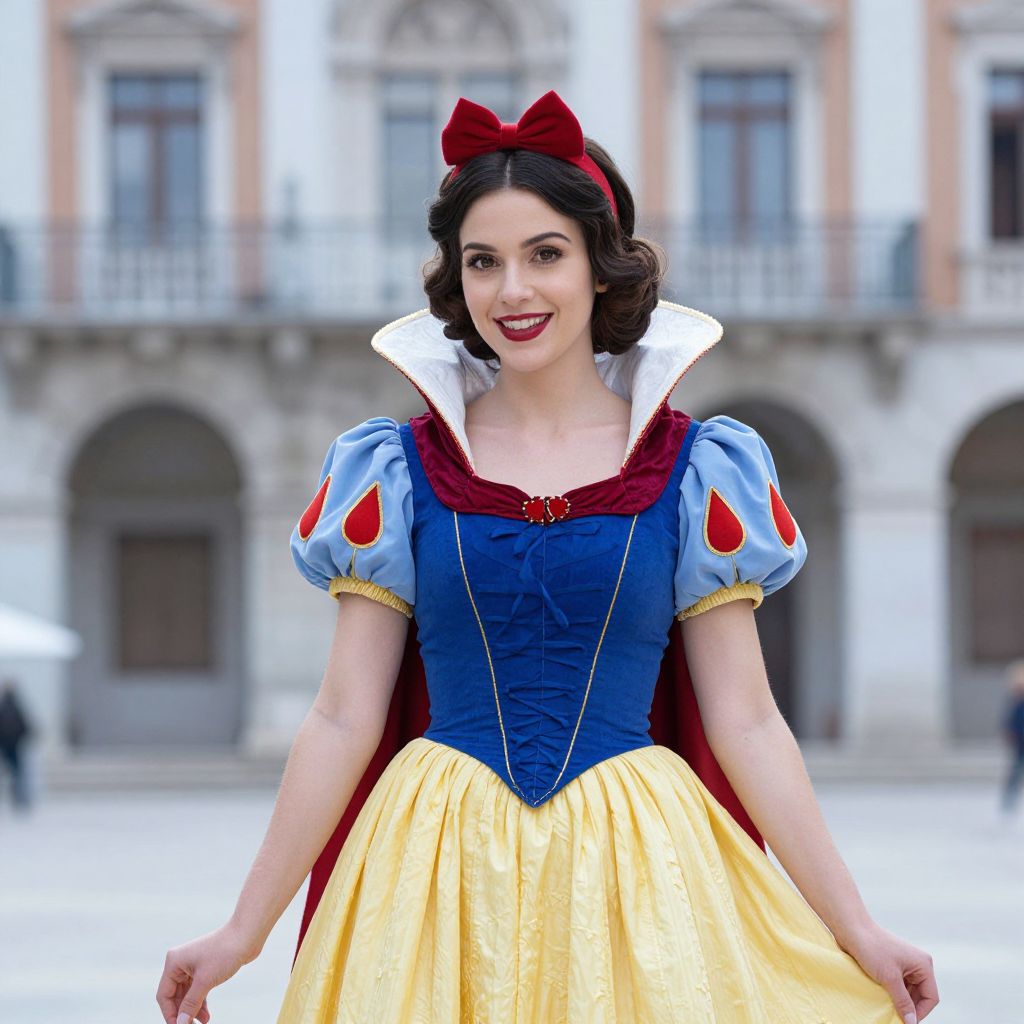 Photograph of a young woman with fair skin and dark brown, wavy hair wearing a traditional Snow White costume. She has a red bow in her hair, a blue bodice with red accents, white puffy sleeves, and a yellow, pleated skirt. She wears a large white collar and a red cape. She smiles with red lipstick, standing in front of a blurred, classical European building with arched windows. The costume is detailed with embroidery, and the overall style is reminiscent of Disney's Snow White. The background is slightly out of focus, emphasizing her as the main subject.