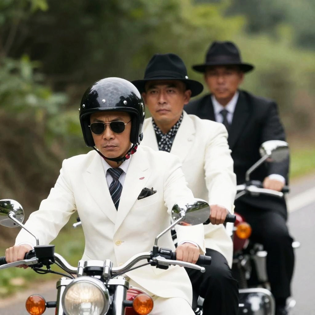 Photograph of three men riding a motorcycle through a forest. Foreground man in white suit, black helmet, sunglasses, and scarf, gripping handlebars. Middle man in black hat, scarf, and white jacket, leaning over. Background man in black suit and hat, riding behind. Green foliage in background. Intense expressions on all three men.
