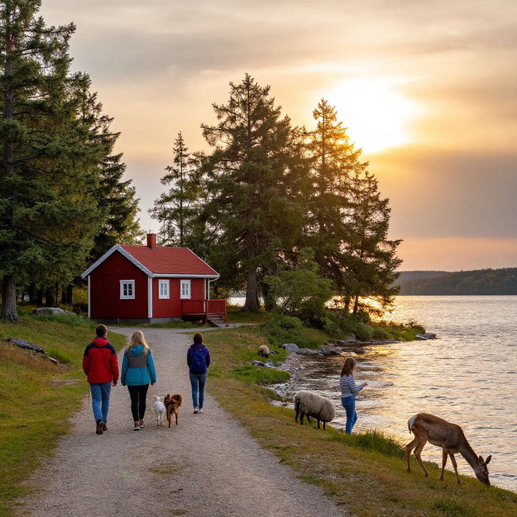 Sunset bathes a serene lakeside scene in vibrant hues, featuring a red cabin nestled among evergreen trees, a winding dirt path leading to the water's edge, and figures interacting with nature—two people walking dogs, a woman observing a sheep, and a deer grazing near the shore, all under a radiant sunburst that dominates the sky.