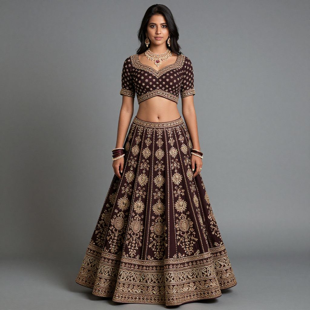 Photograph of a South Asian woman with dark hair, wearing an elaborate black and gold embroidered traditional lehenga choli, against a gray backdrop.