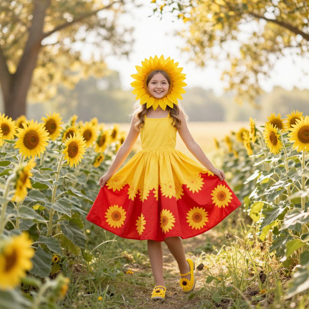 A vibrant girl in a sunflower costume, wearing a bright yellow dress with a red skirt that flows elegantly, yellow floral patterns mimicking sunflower petals, and matching yellow shoes with tiny sunflower details on the soles. She stands in a sunny meadow with golden light filtering through the trees, her smile bright and joyful, surrounded by real sunflowers swaying gently in the breeze. The background features soft pastel tones and a warm, natural landscape, enhancing the cheerful and whimsical atmosphere.