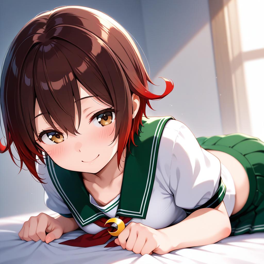 Mutsuki kai ni (kancolle), kantai collection, 1girl, red eyes, brown eyes, short hair, brown hair, gradient hair, red hair, serafuku, serafuku, green skirt, pleated skirt, green sailor collar, crescent pin, red neckerchief, by artist nanahara fuyuki, illustrious